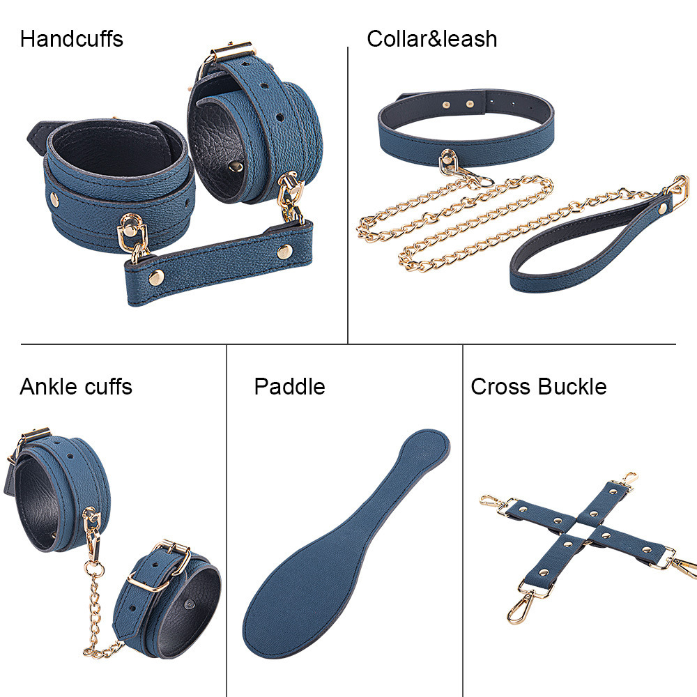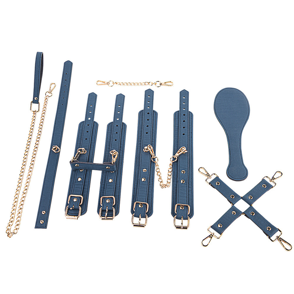 5-osainen sidontasetti, vaaleansinistä keinonahkaa. Tuo sidontaleikkeihin ripaus ylellisyyttä tämän sidontasetin avulla, jossa yhdistyvät miellyttävä keinonahkamateriaali, kullanväriset metalliyksityiskohdat ja Freyonalle tyypillinen hallittu sensuaalisuus. Setti sisältää ranteisiin ja nilkkoihin tulevat pehmustetut kahleet, säädettävän kaulapannan talutushihnalla, jämäkän paddlen sekä X-muotoisen ristikiinnikkeen (hogtie), jonka avulla kaikki osat voidaan ankkuroida yhteen. Pehmeä sisäpuoli suojaa ihoa, kun taas ulkopinnan rakenne antaa setille sen näyttävän, modernin ilmeen.