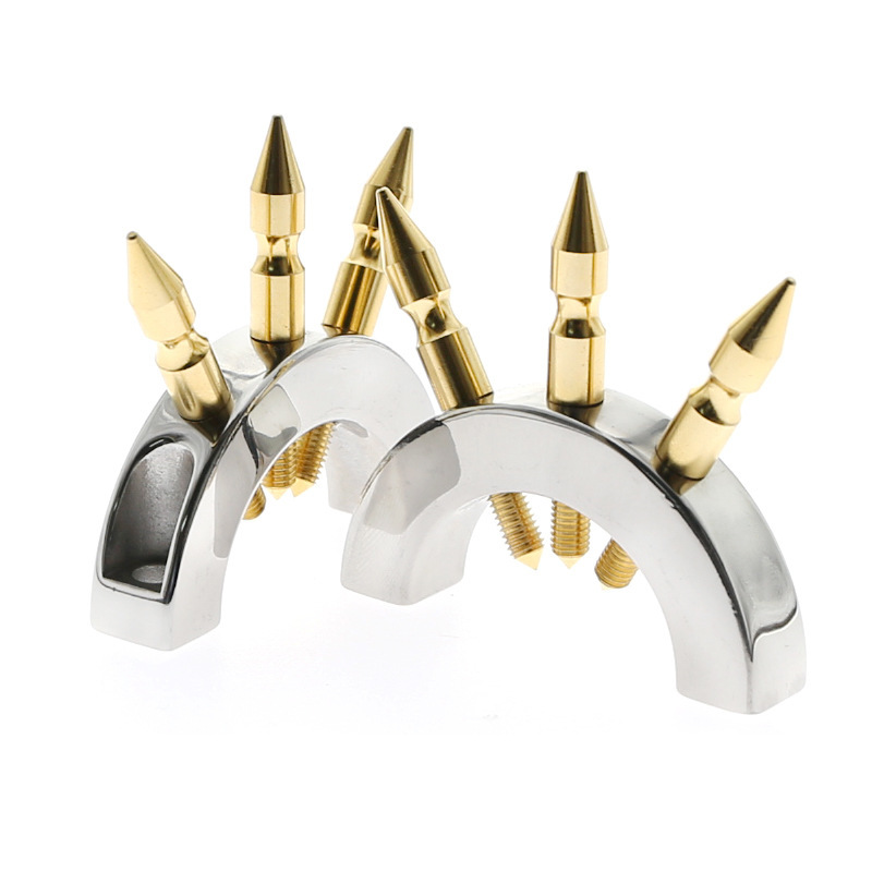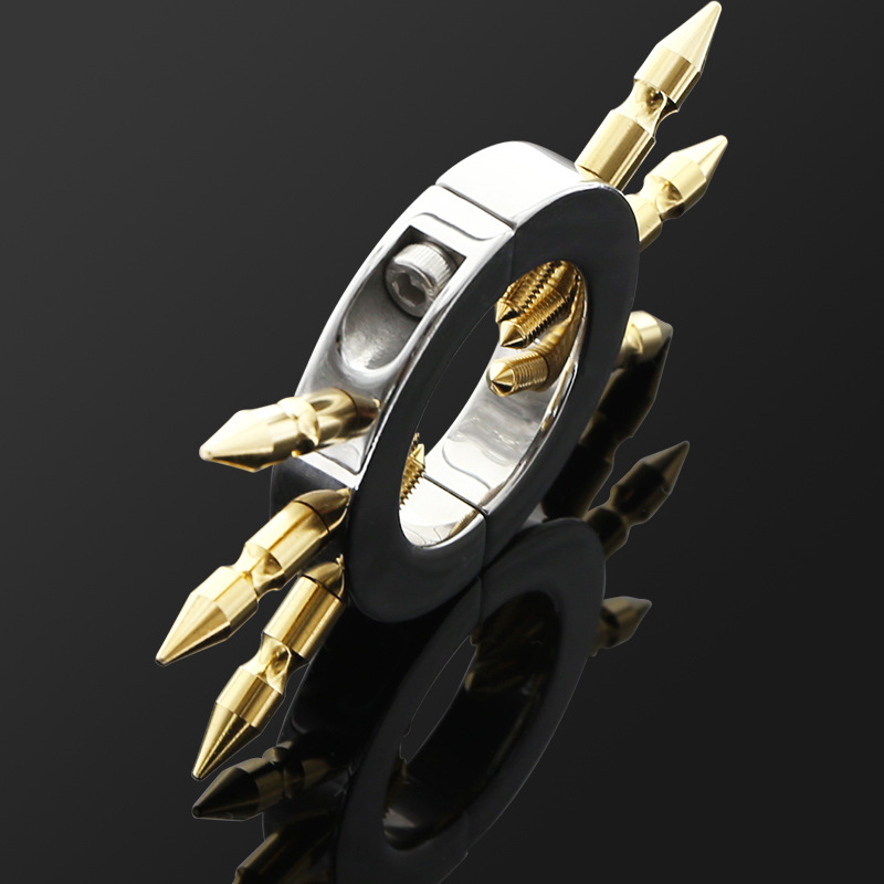 Kullansävyiset piikit luovat visuaalisesti voimakkaan kontrastin kiillotettuun teräsrunkoon ja korostavat sen rituaalista estetiikkaa. Rakenteen lukittava mekanismi pitää renkaan vakaasti paikallaan, ja vaihdettavat osat mahdollistavat erilaisten asetusten kokeilemisen ilman kompromisseja laadussa.