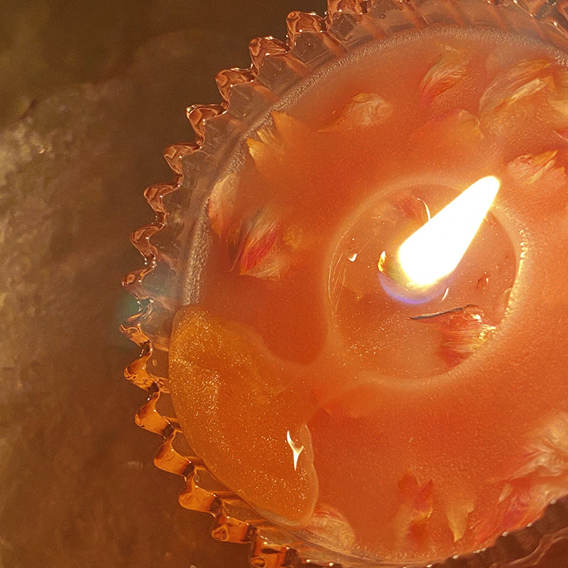 Elegantti, matalalämpöinen petal-kynttilä, jossa lasinen koristekupu, käsintehdyt terälehdet ja luksusmainen kultafolioefekti. Turvallinen, puhdas ja täydellinen tunnelmanluoja.