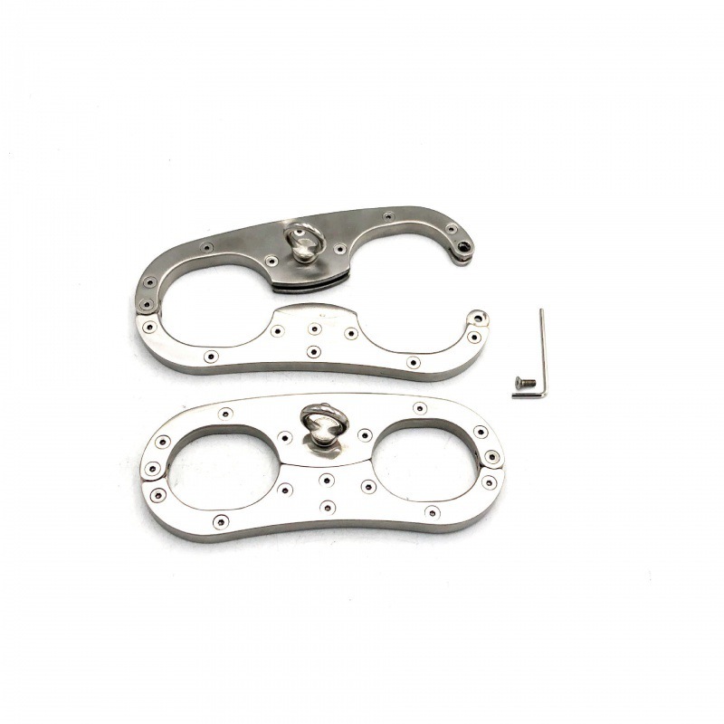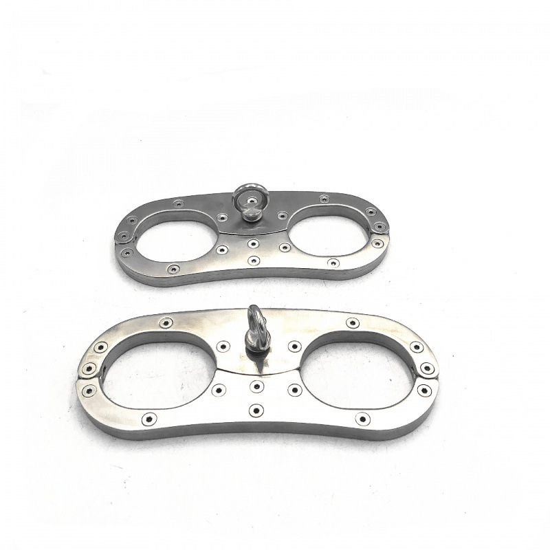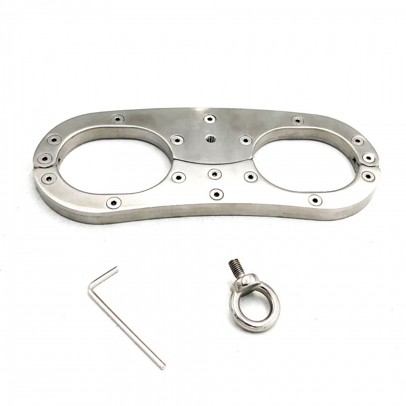 Tarkka ruuvikiinnitteinen rakenne ja keskellä sijaitseva D-lenkki mahdollistavat ketjut, köydet tai symbolisen lukituksen. Teräksen kylmyys ja mekaaninen estetiikka tekevät tästä enemmän kuin pelkän välineen – se on julma, kaunis objekti, joka näyttää yhtä voimakkaalta kuin tuntuu.