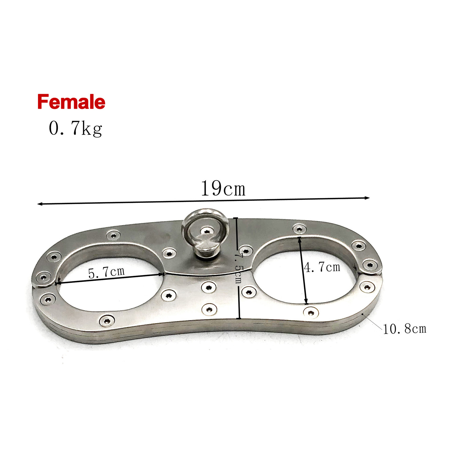 Kiinteät käsiraudat on raskas, ruostumattomasta teräksestä valmistettu ranneblokki niille, jotka kaipaavat vahvaa mekaanista tuntumaa ja tinkimätöntä kontrollia. Tämä massiivinen metallinen kappale sulkee ranteet symmetrisesti vastakkain, tehden jokaisesta liikkeestä pienen ja harkitun. Paino – 0,7 kg (S) ja 0,85 kg (M) – tuo fyysisen läsnäolon, joka tuntuu jokaisella sekunnilla.