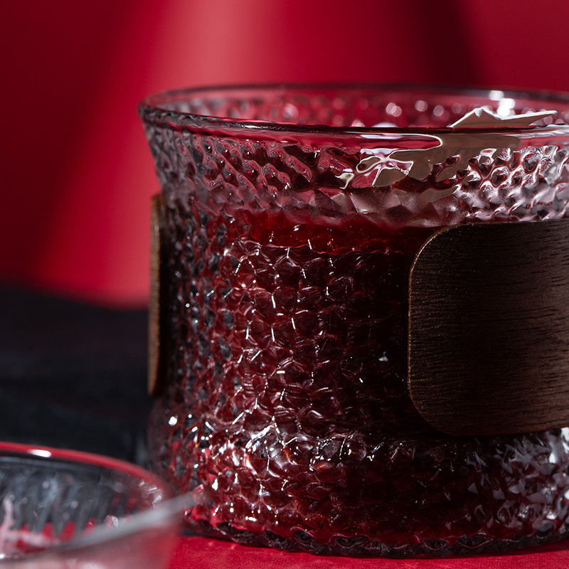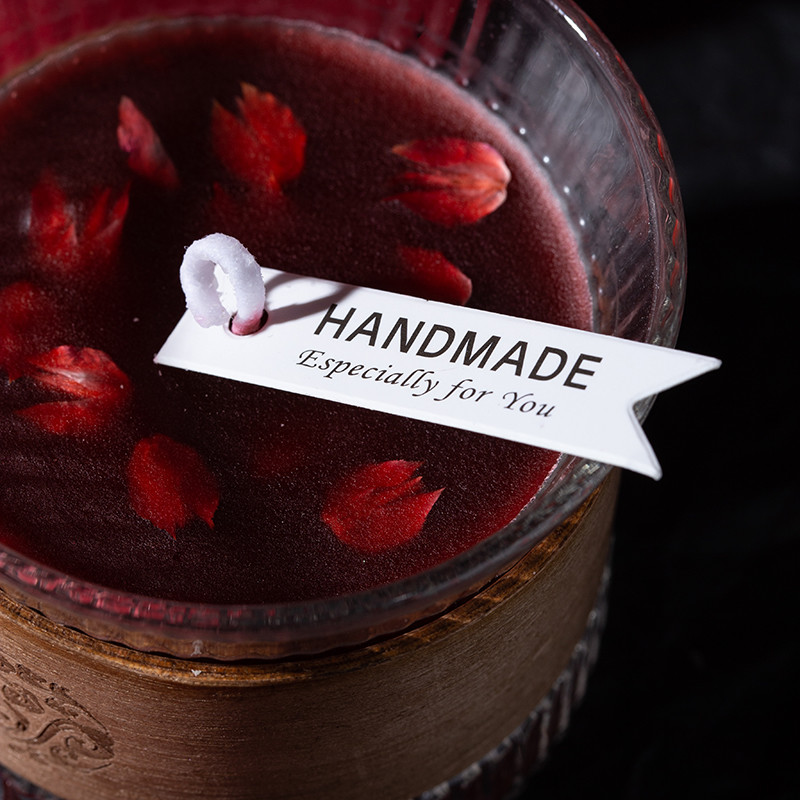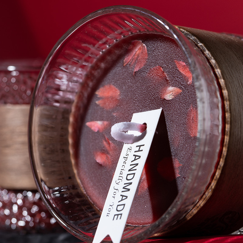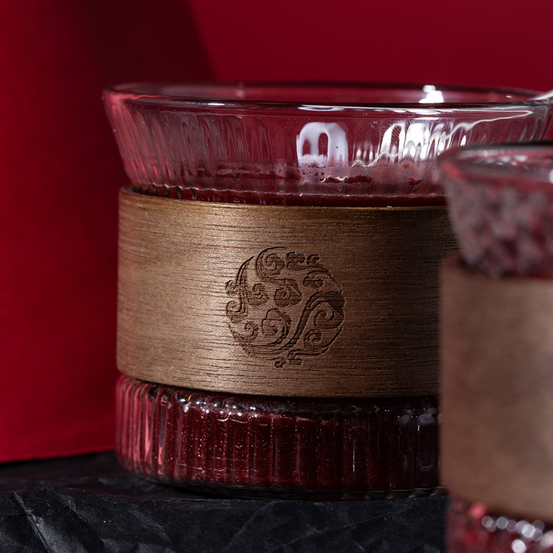 Lasikuppikynttilät setti tuo yhteen kaksi näyttävää kynttilää, jotka täydentävät toisiaan sekä estetiikan että tunnelman osalta. Setti sisältää yhden koristeellisen röpelöreunaisen lasikupin ja yhden elegantisti raidallisen lasi kupin. Molemmissa kynttilöissä hehkuu sama syvänpunainen vaha, jota koristavat pinnalla leijuvat terälehdet — visuaalinen yksityiskohta, joka tekee jokaisesta kynttilästä ainutlaatuisen.