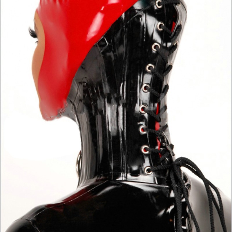 Astetta intensiivisempi ulkonäkö syntyy silloin, kun muoto ja materiaali ottavat vallan. Tämä setti yhdistää kaksi elementtiä, jotka korostavat valtaa, hiljentämistä ja täydellistä kehonkieltä: punaisen, 0.4 mm latex-hupun sekä siihen saumattomasti istuvan, 1.0 mm paksun mustan korsettikauluksen.