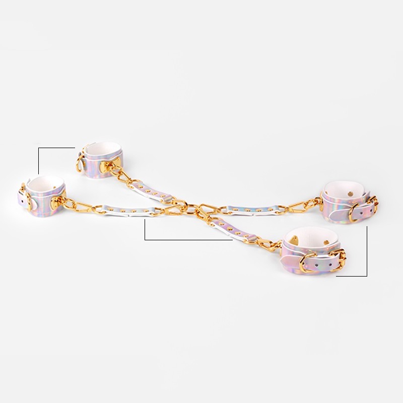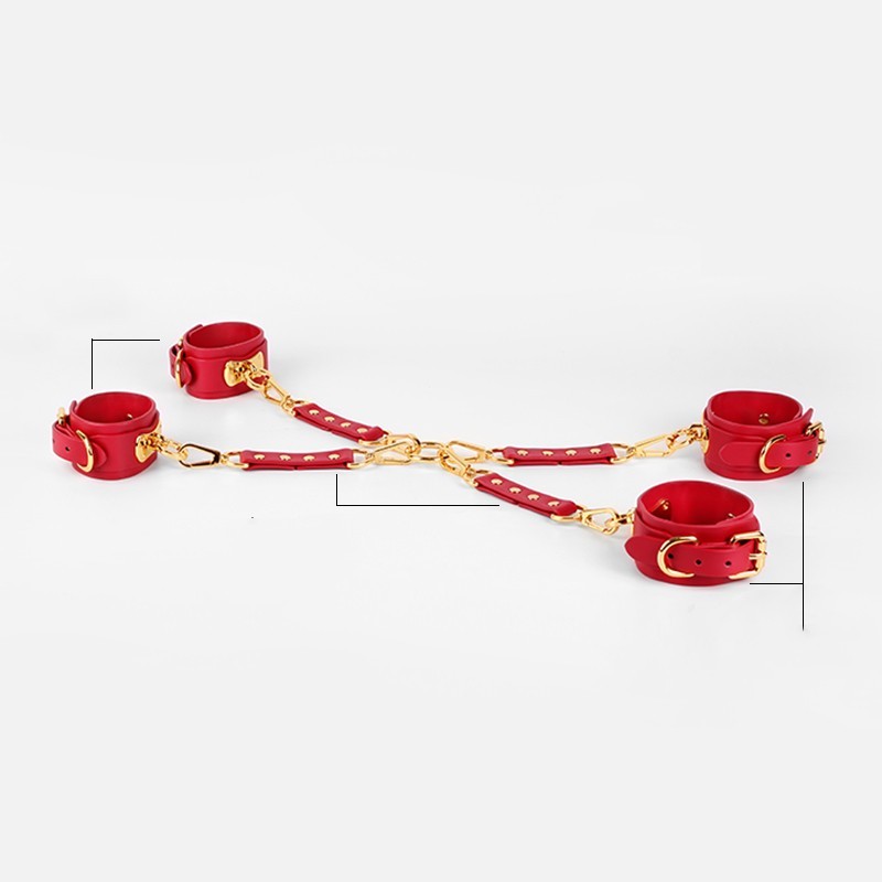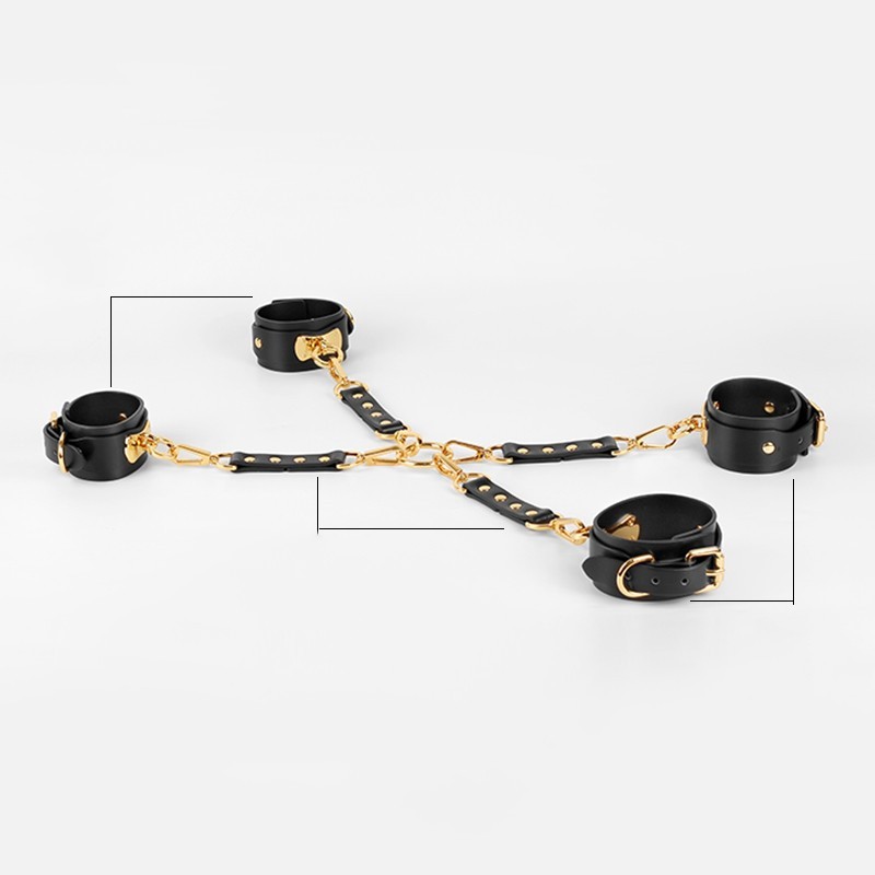 Suunniteltu intensiiviseen, silti turvalliseen käyttöön: kahleet ovat tukevat mutta sisältä pehmeät, mikä tekee niistä miellyttävät myös pidempään sidontaan. Laadukas sinkkiseosmetalli tuo kestävyyttä, ja koristeelliset kiinnityslevyt lisäävät juuri sen ripauksen eleganttia estetiikkaa.