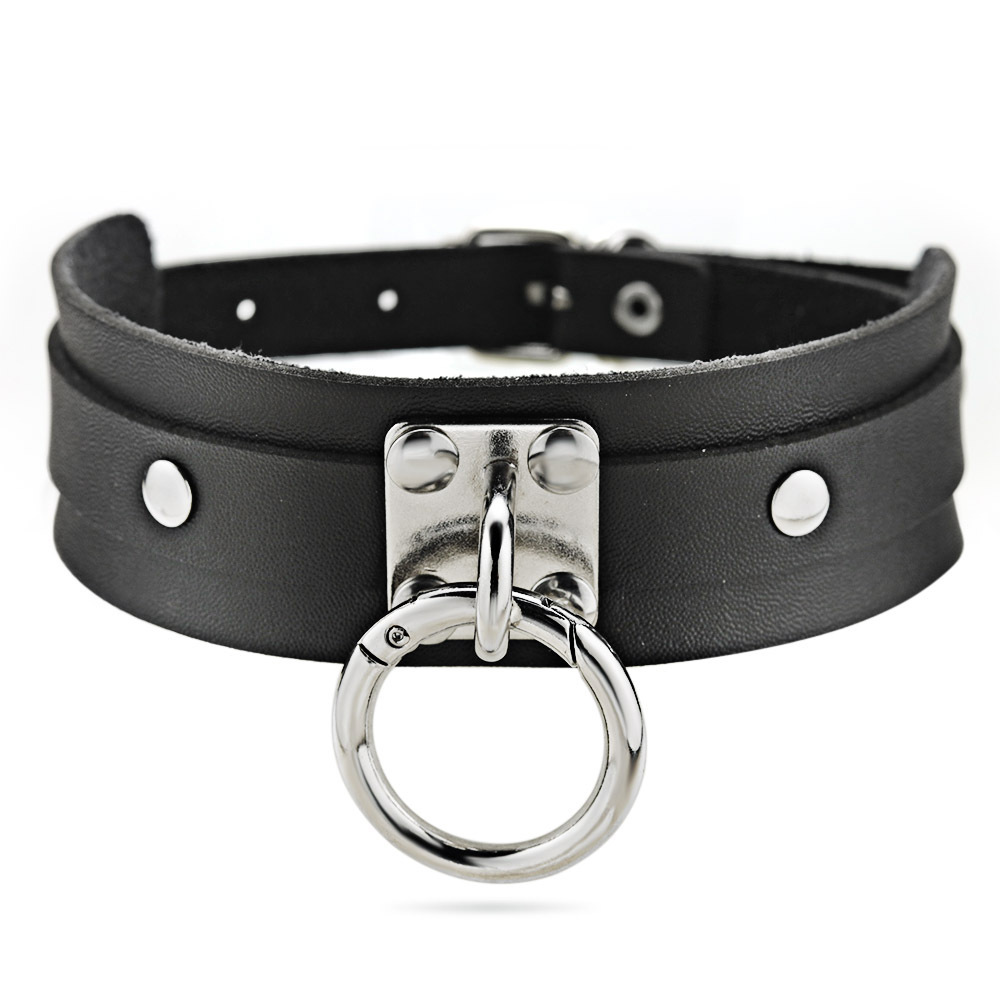 Tämä O-rengaskaulapanta on ajattoman selkeä osa vaihtoehtoista tyyliä ja rooliasusteita. Leveä, noin 3,4 cm, hihna antaa tukea ja istuu tasaisesti kaulalla, kun taas etuosan metallirengas toimii visuaalisena keskipisteenä.