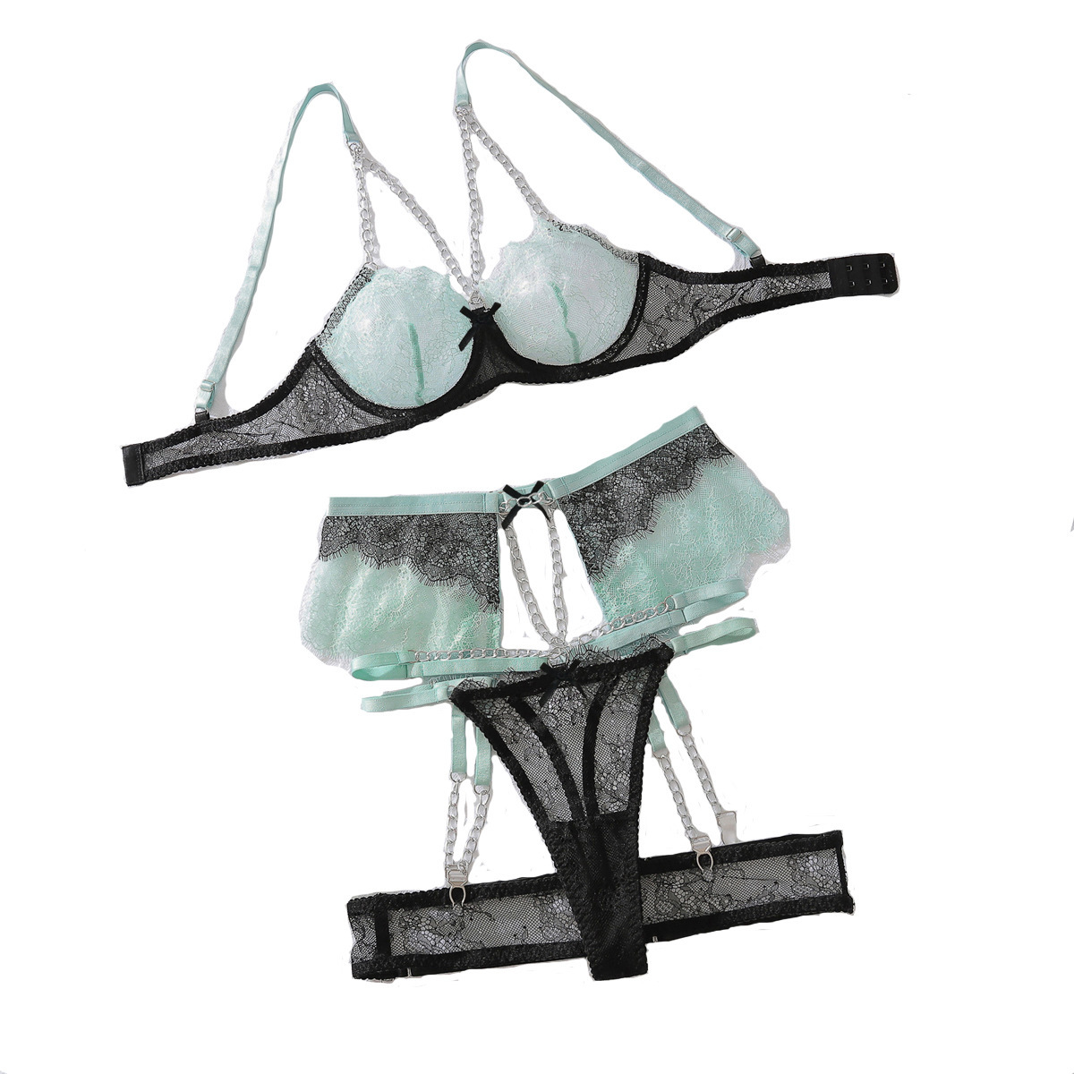 Pitsinen Alusasusetti Ketjuilla on rohkea ja huomiota herättävä alusasusetti. Se yhdistää jäisen mintun ja mustan pitsin – herkkyyden ja hallinnan täydellisessä tasapainossa. Metalliketjuin koristeltu sukkanauhavyö kehystää vartalon kuin koru, ja kevyesti topatut kupit antavat push-up -tuen, joka korostaa rintalinjaa juuri oikealla tavalla.