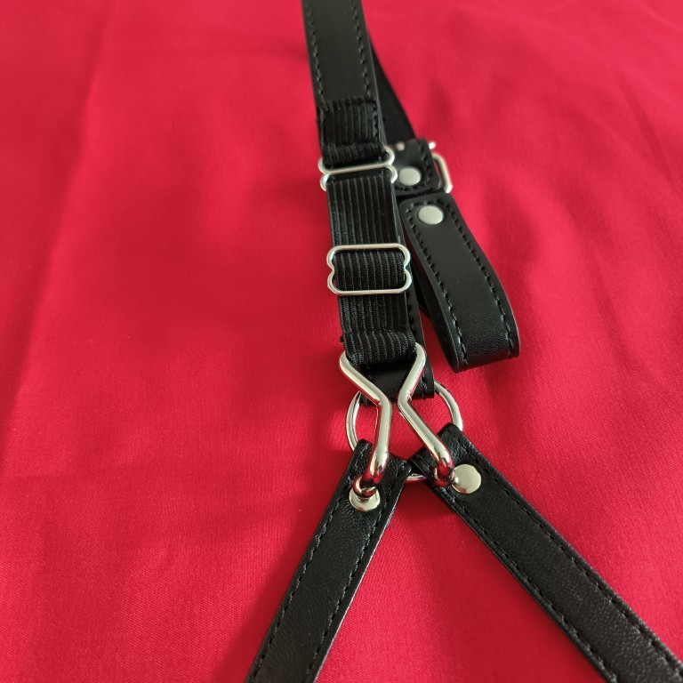 Keinonahkainen hihnasto on useasta kohdasta säädettävä ja tukevasti niitattu. Nenäkoukun säätöhihna on joustava ja elastinen (nylon/tekstiili), mikä helpottaa istuvuuden hienosäätöä ja lisää käyttömukavuutta. Rakenne sopii sekä naisille että miehille ja on tarkoitettu aikuisille käyttäjille, jotka etsivät klassista gag’ia lisäkontrollilla.
