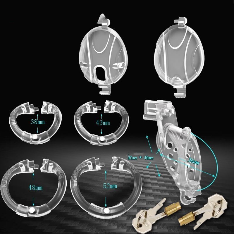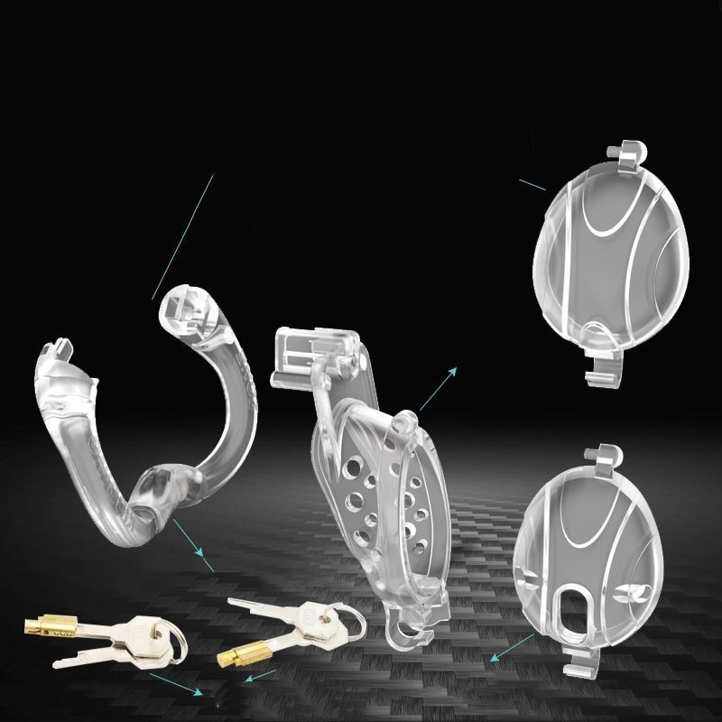 Kevyt kaksiosainen muovinen siveysvyö miehille. Vaihdettavat häkkiosat, liikkuva lukitusrengas, avattava rakenne ja irrotettava kansi. Kaksi väriä: musta ja läpinäkyvä.