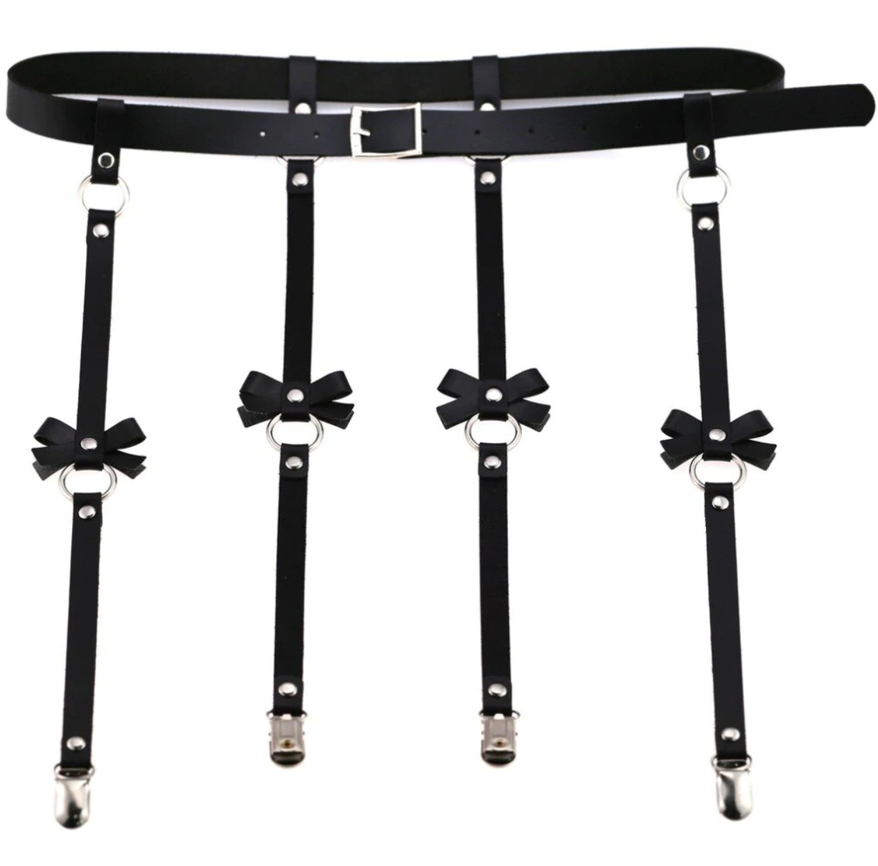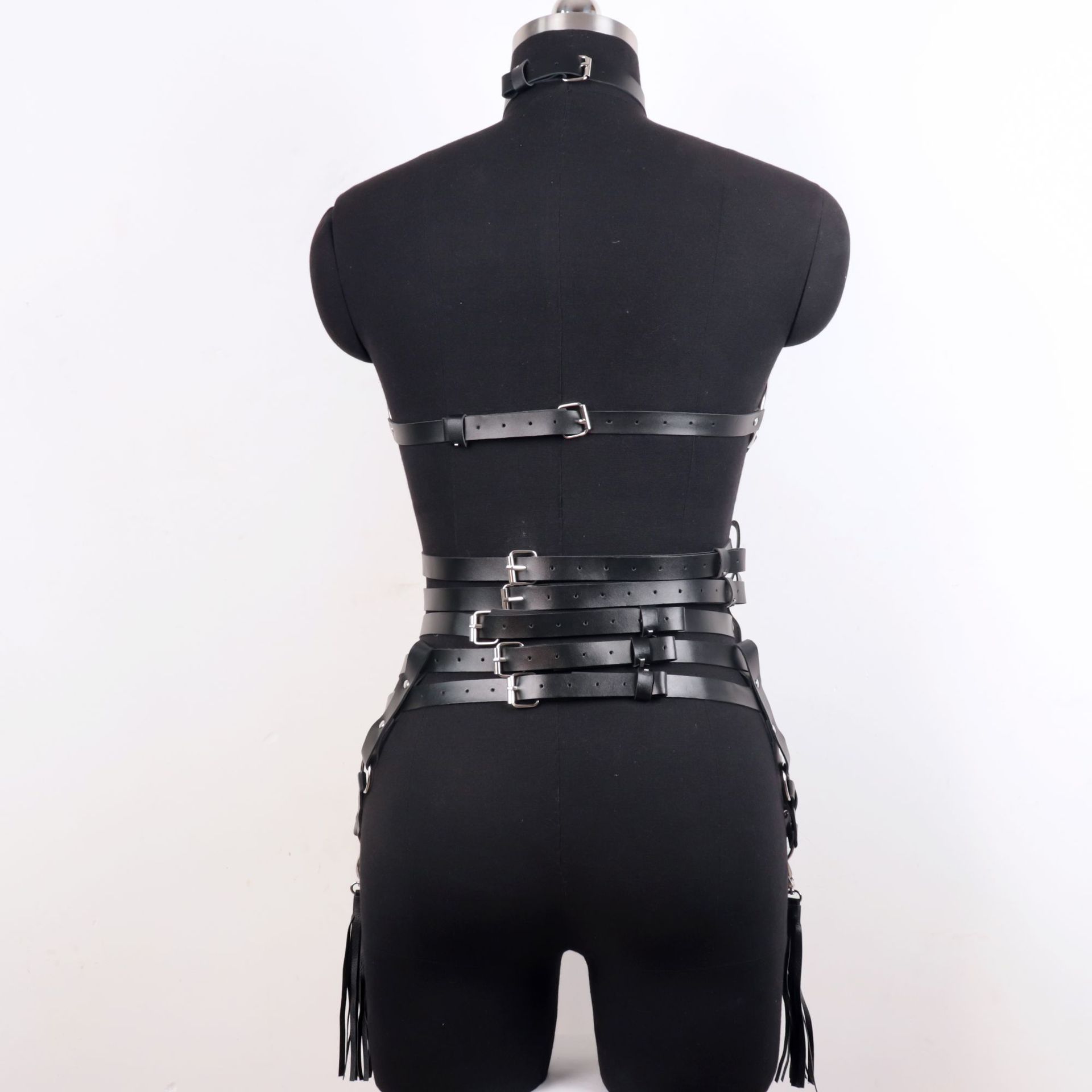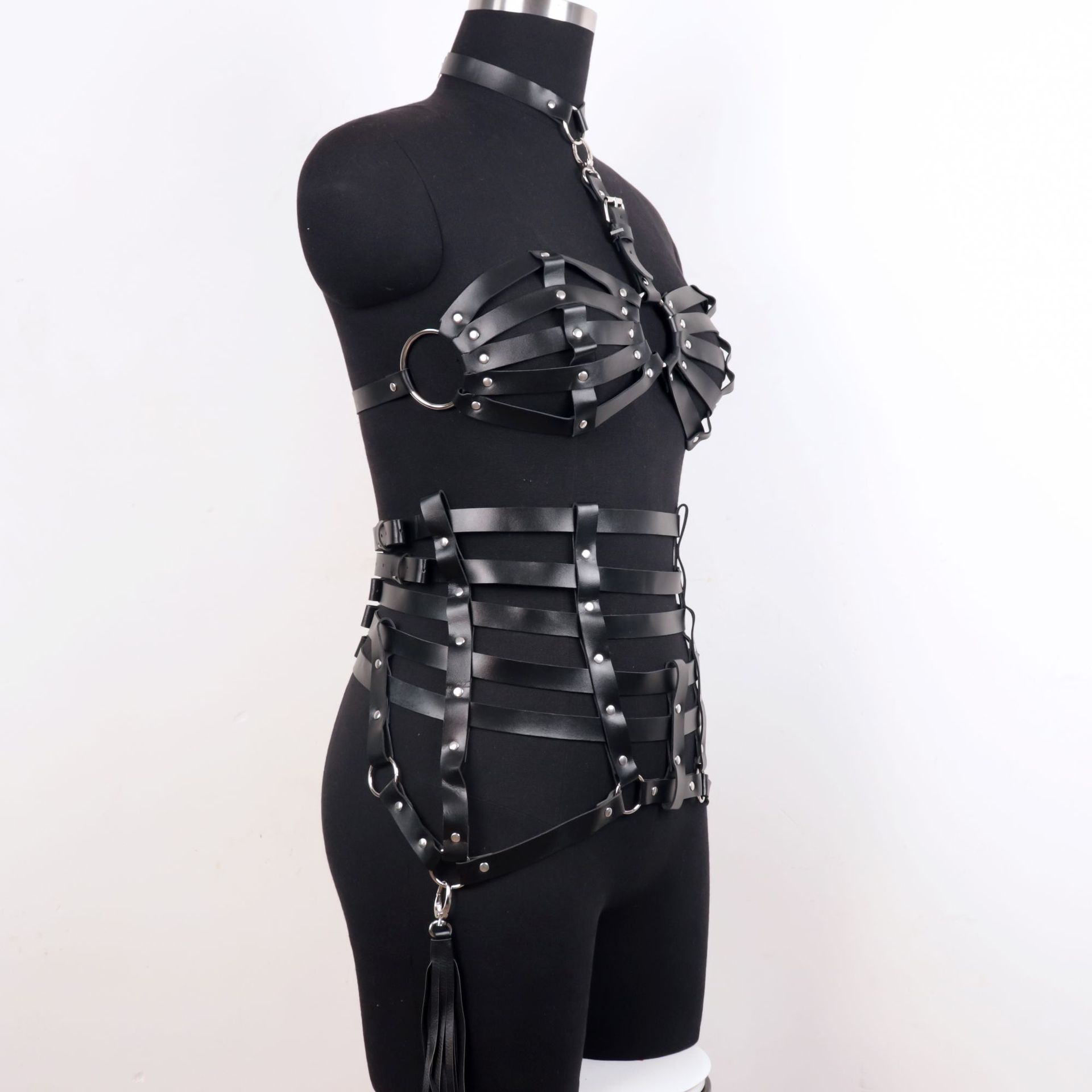 Tämä strappy harness -setti on rakennettu näyttäväksi kokonaisuudeksi, jossa yläosa ja alaosa muodostavat yhtenäisen, vahvan linjaston. Keinonahkaiset hihnat, metallirenkaat ja niittiyksityiskohdat luovat visuaalisesti kerroksellisen rakenteen, joka korostaa vartalon muotoja ja tuo asuun voimakasta estetiikkaa.