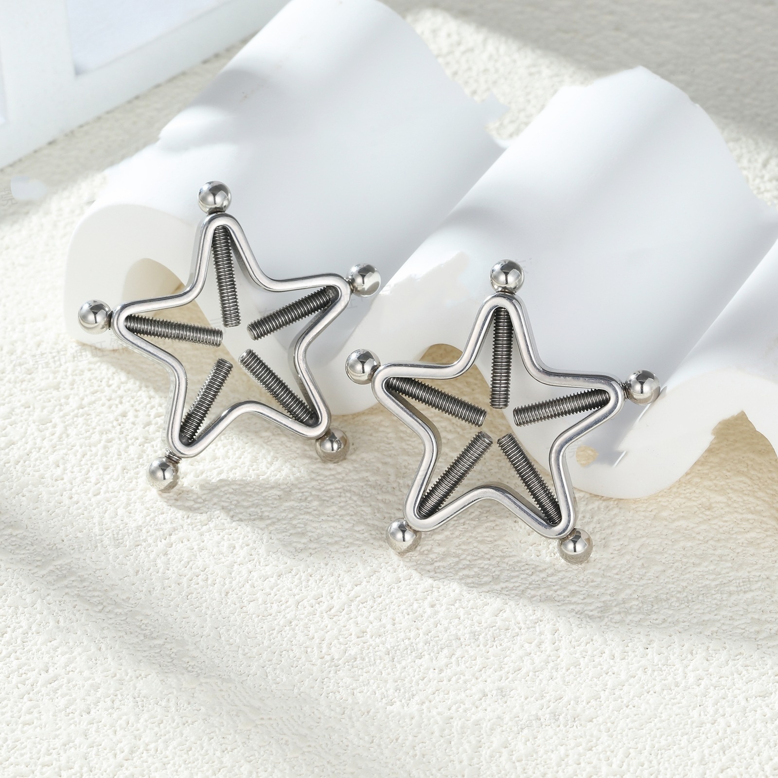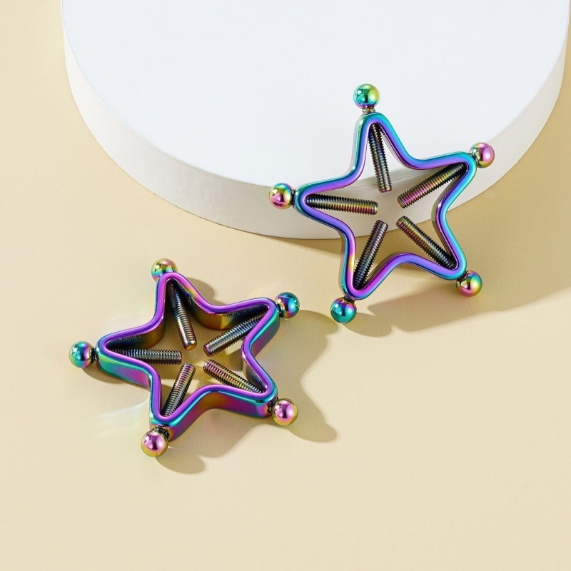 Näyttävät ja säädettävät nänninipistimet ruostumattomasta teräksestä. Tähdenmuotoinen runko ja ruuvimekanismi mahdollistavat puristuksen tarkan säädön. Suunniteltu lyhytaikaiseen käyttöön ja hetkiin, joissa estetiikka on osa nautintoa.