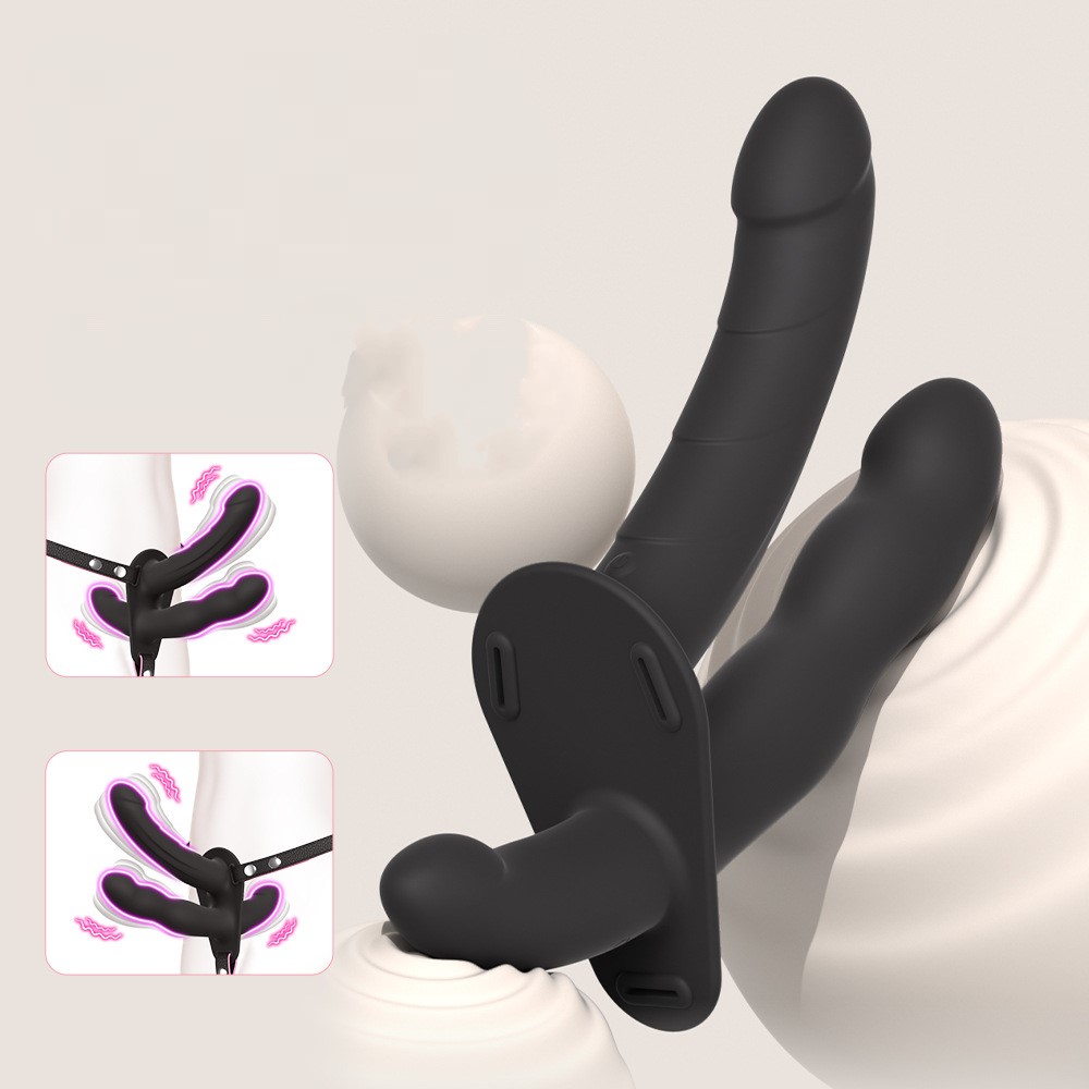 Kolmiosainen strap-on kaukosäätimellä: yksi varsi käyttäjälle ja kaksi vastaanottajalle. Pehmeä liquid silicone, 10 värinätilaa ja vakaa harness-rakenne.