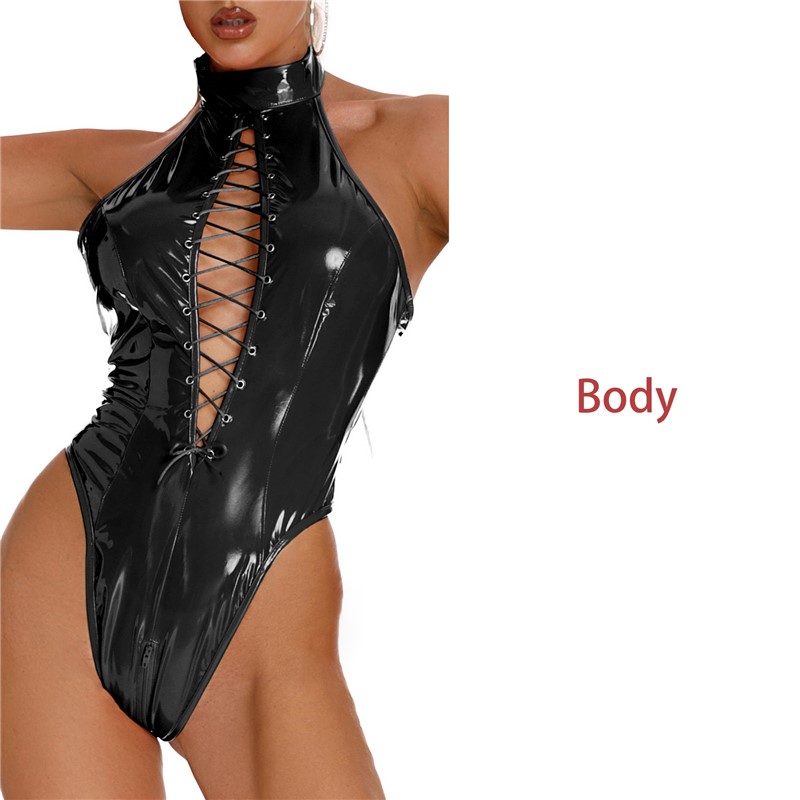 Kiiltäväpintainen wetlook-body on suunniteltu niille, jotka hakevat rohkeaa siluettia ja vahvaa fetishiä ilman kompromisseja. Halterneck-malli korostaa hartialinjaa, ja edessä kulkeva nyöritys tuo sekä visuaalista dramatiikkaa että kevyttä säätövaraa istuvuuteen. Materiaali joustaa miellyttävästi ja myötäilee vartaloa napakasti.